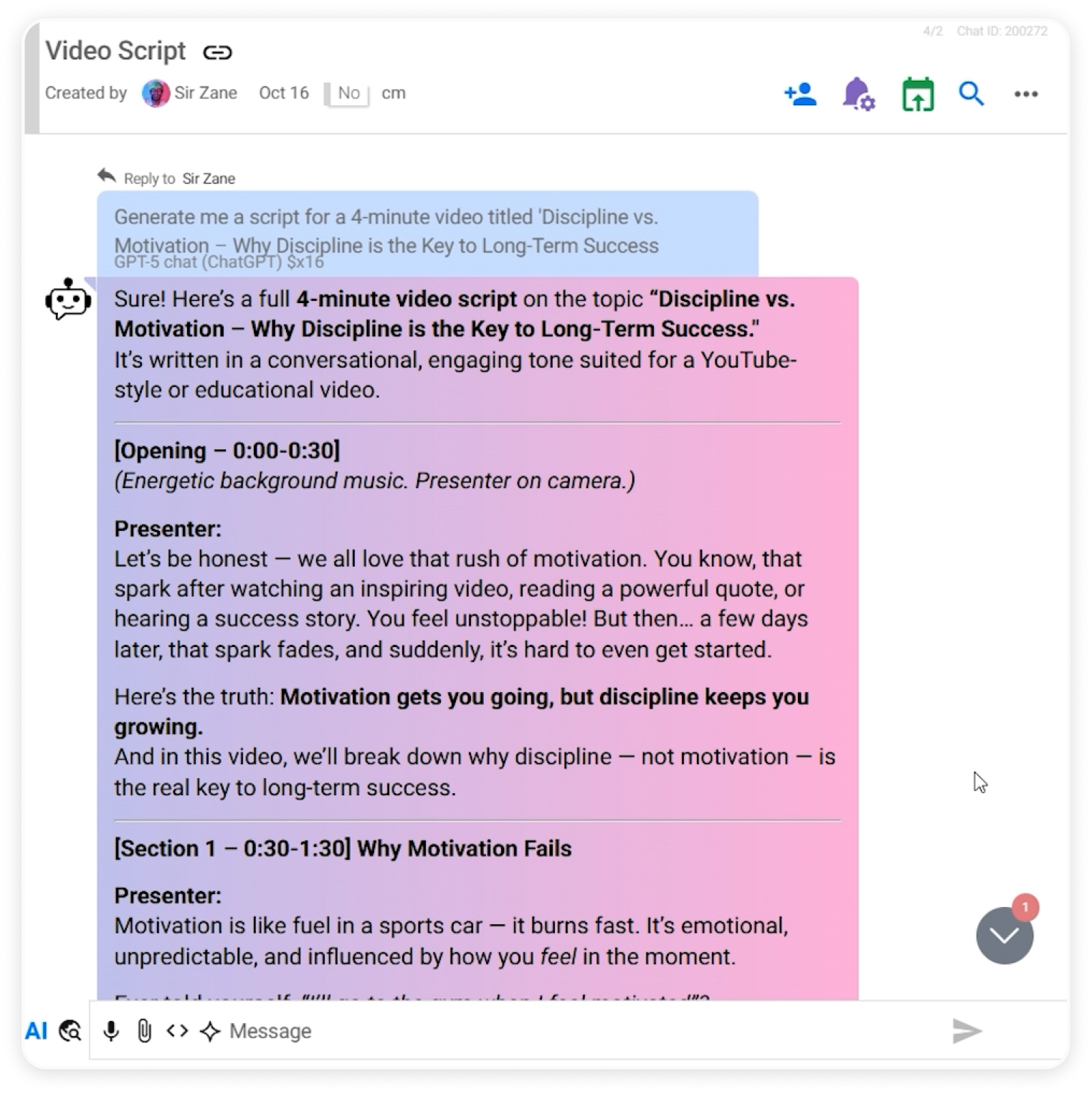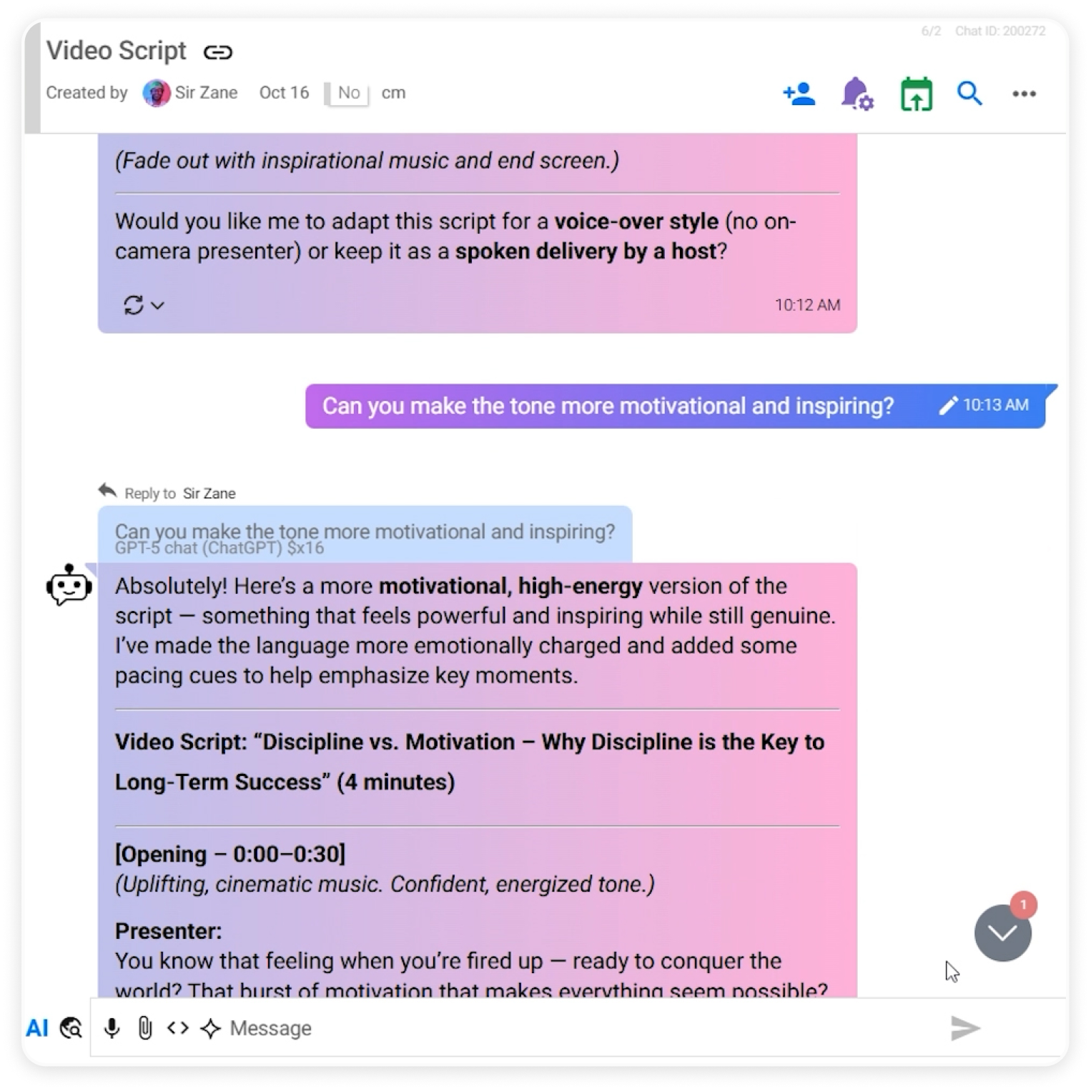 This makes the chat a flexible workspace for developing and polishing your video script.