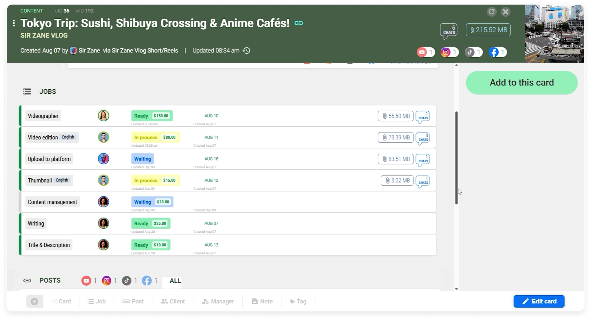 Each card contains everything related to that specific content, from tasks and files to publishing details and performance metrics.