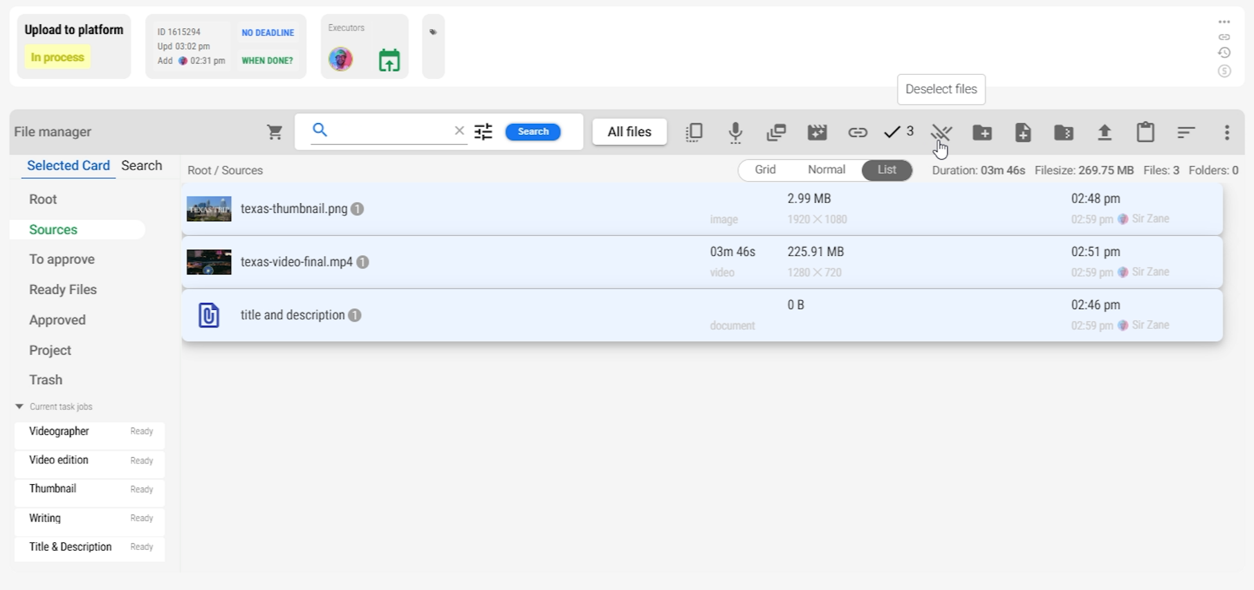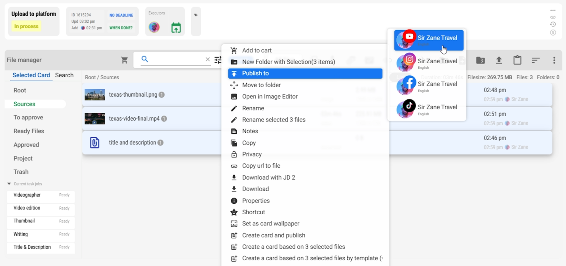 You can gather all ready files (video file, thumbnail, title & description document) into the Upload to Platform task.