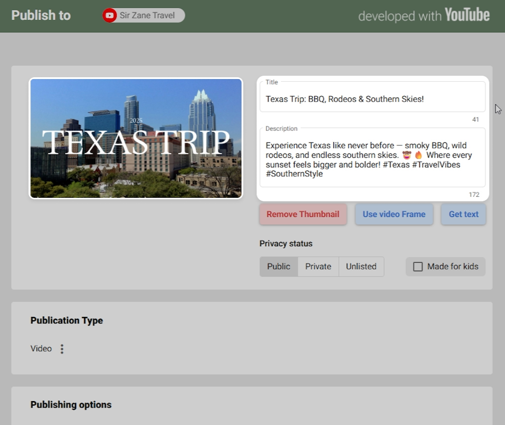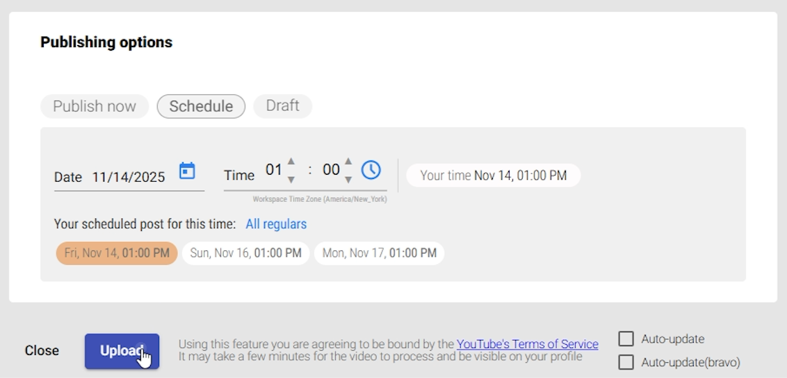 After clicking "Upload", your video will be processed and then scheduled for publication on the selected platform.