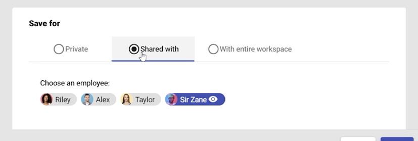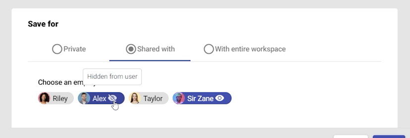 - Share with specific workspace member and choose whether it should be visible or hidden to them.