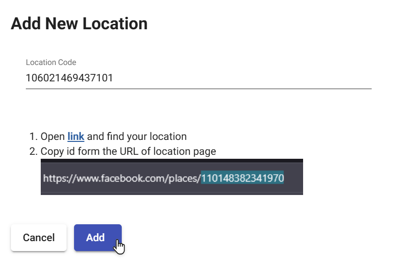 If your desired location (city) is not listed in the provided dropdown, you can still add it manually using a Facebook location code.
