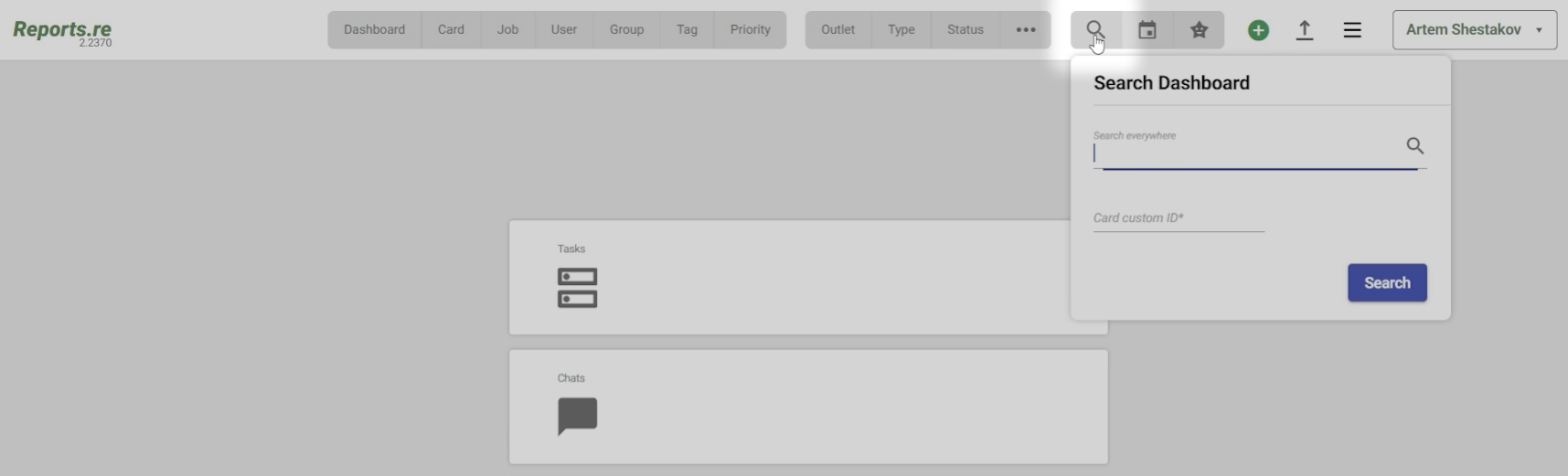 - In Reports dashboard, hover the Search button on the top panel.