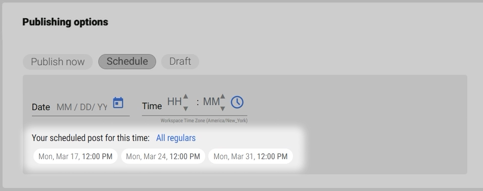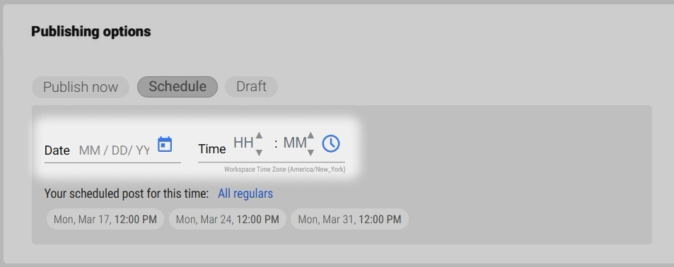- Schedule: Allows you to select a specific date and time to publish the content. Useful for planning ahead or aligning with a content calendar.