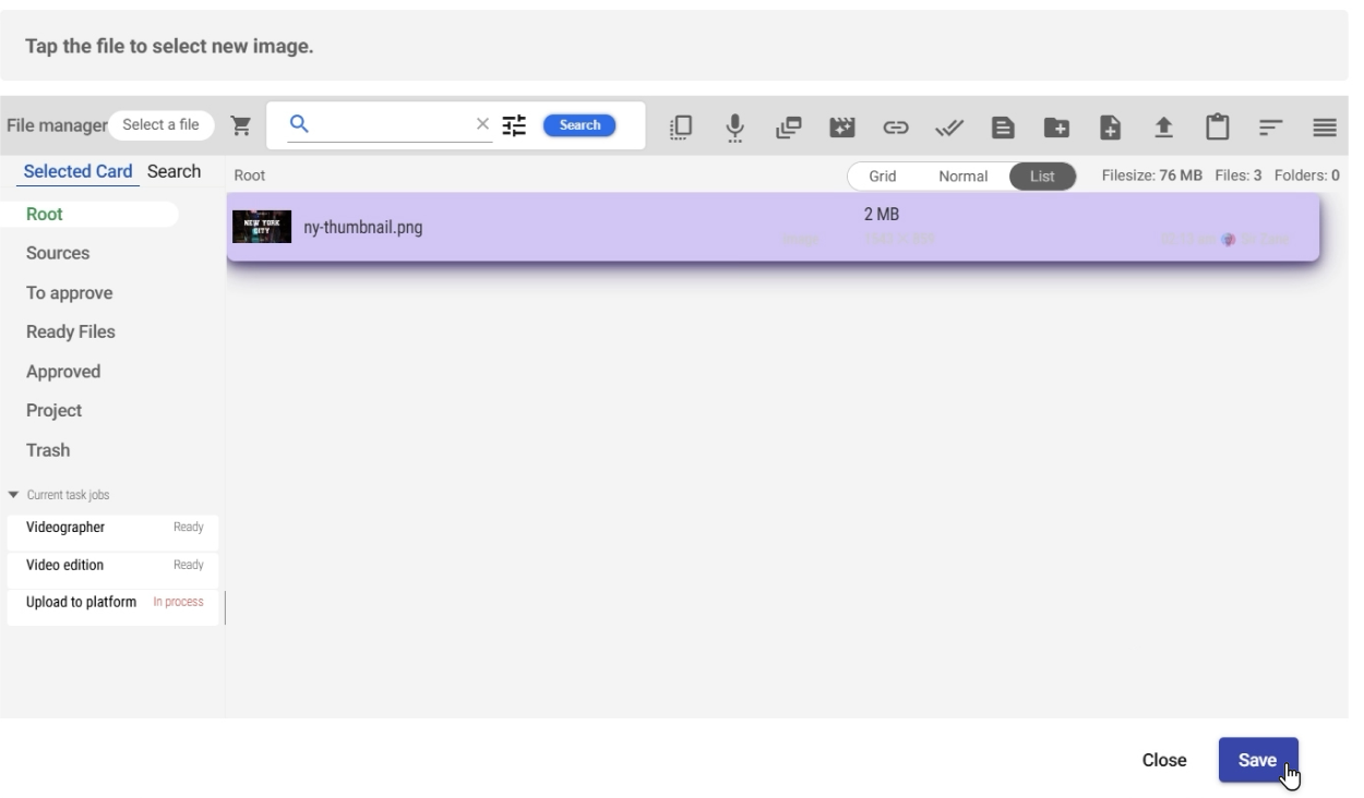 - Select a thumbnail image from your files and click "Save".