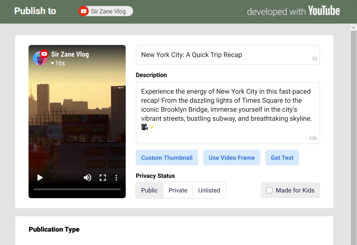 Publishing in Reports.re allows you to easily distribute finalized videos directly to your preferred content platforms. The workflow is designed to be efficient and user-friendly, supporting automatic metadata retrieval, flexible scheduling options, and custom thumbnail assignment—all within a few clicks.