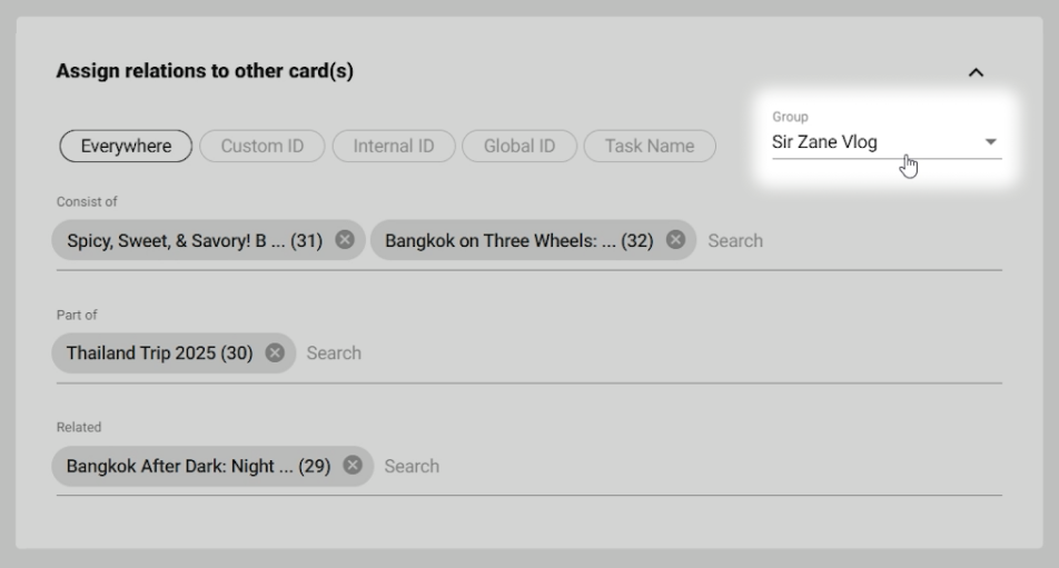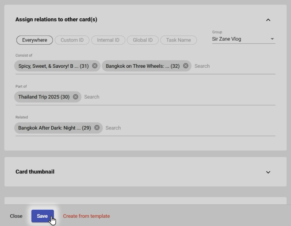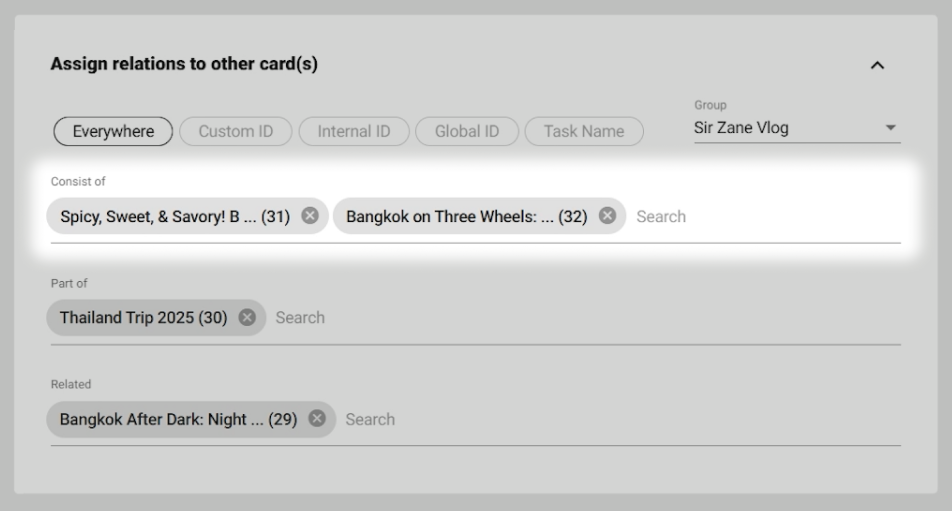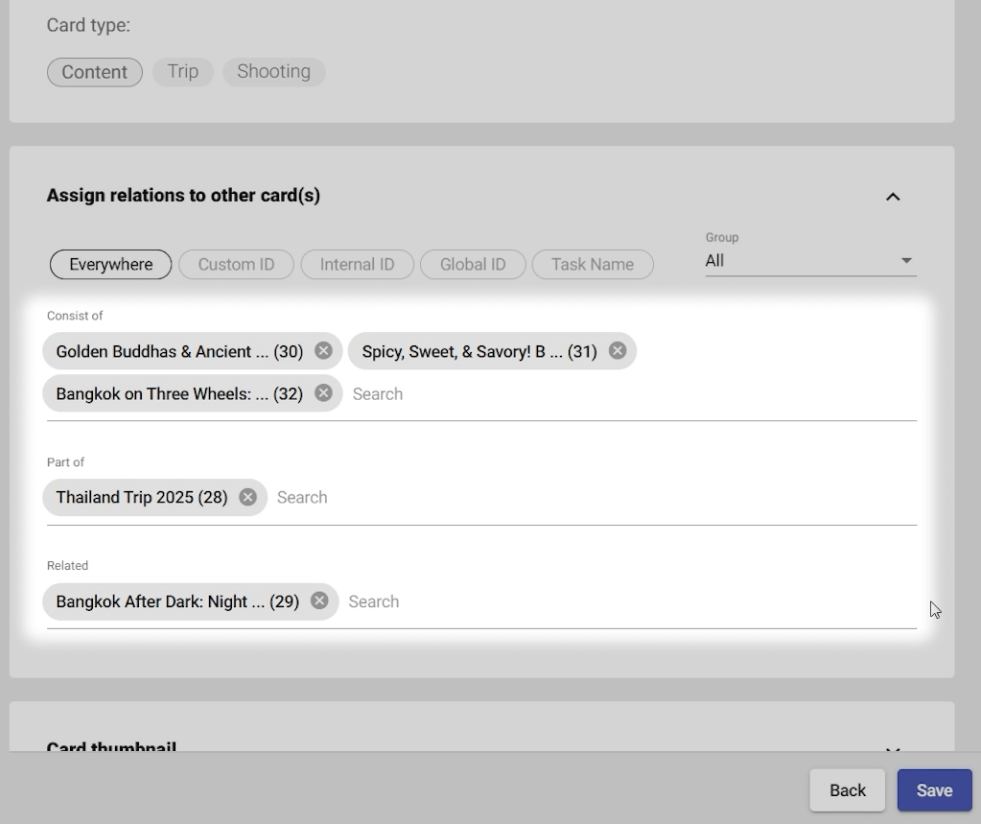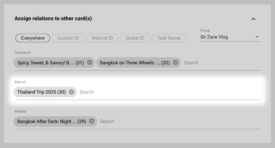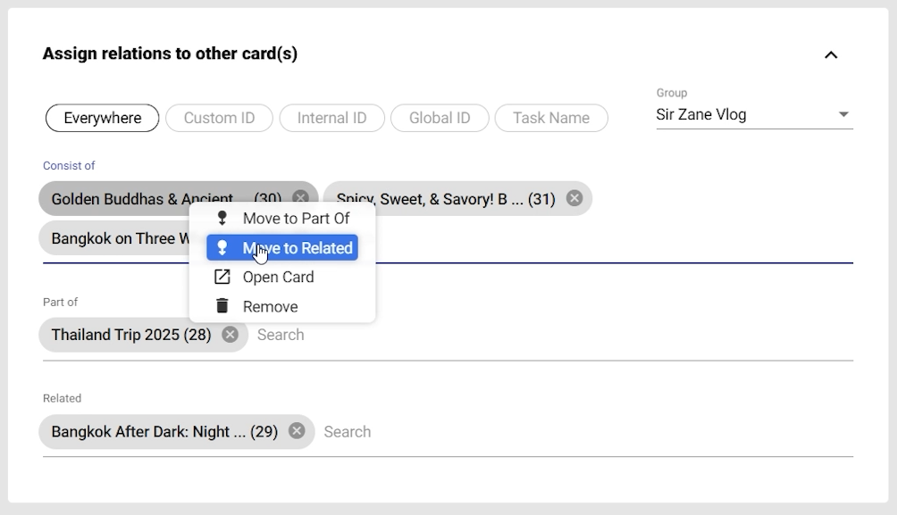 - "Part of" — for linking this card into a parent card (e.g., the video in the card is part of “Thailand Trip 2025”).