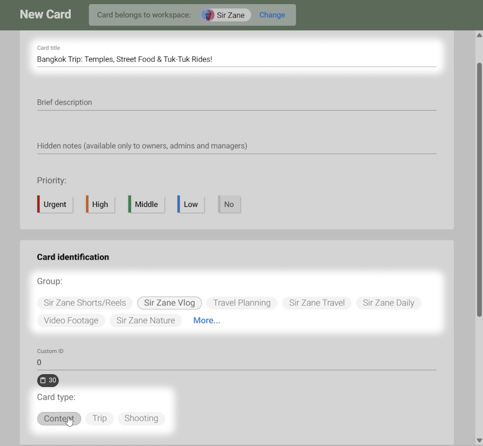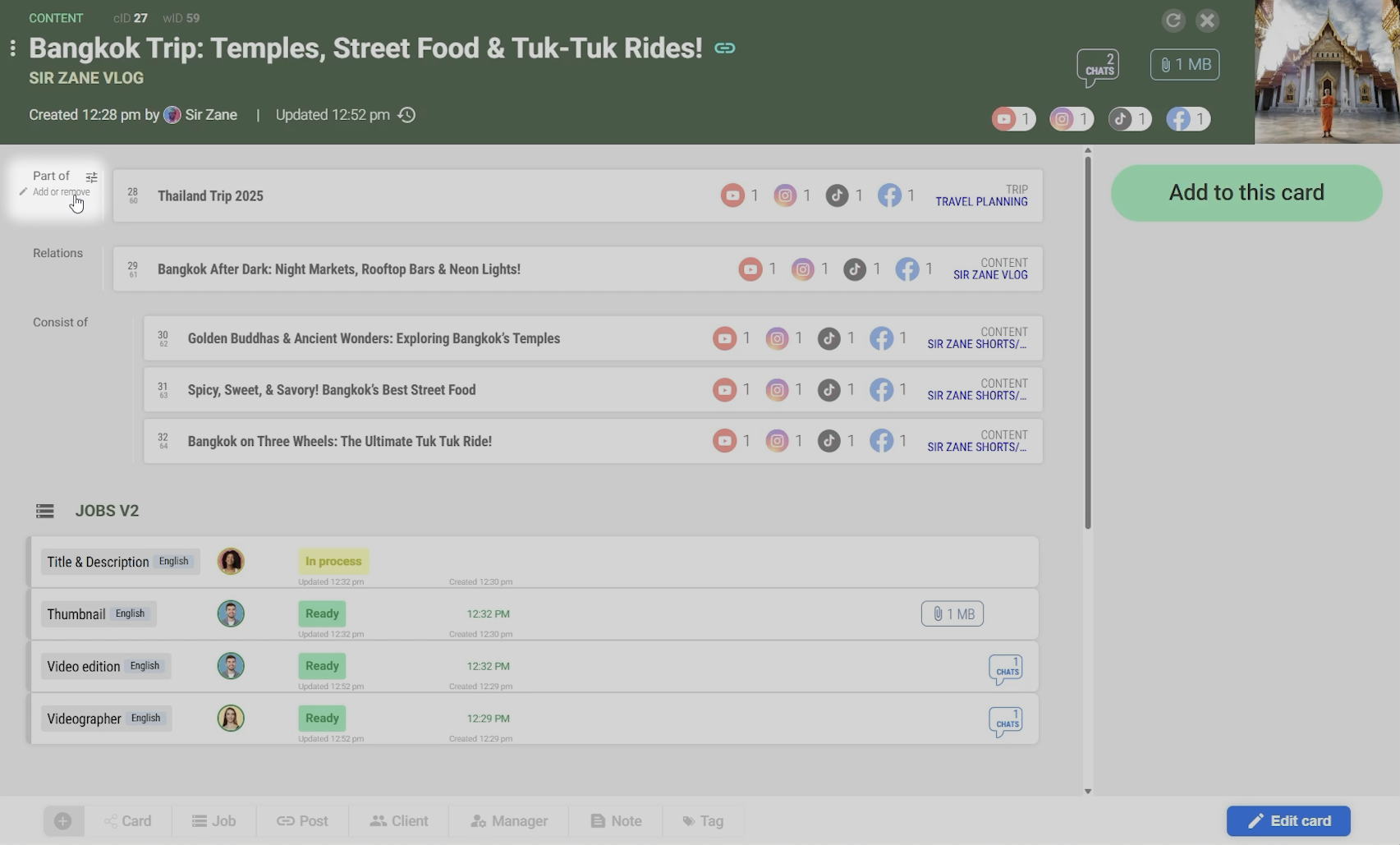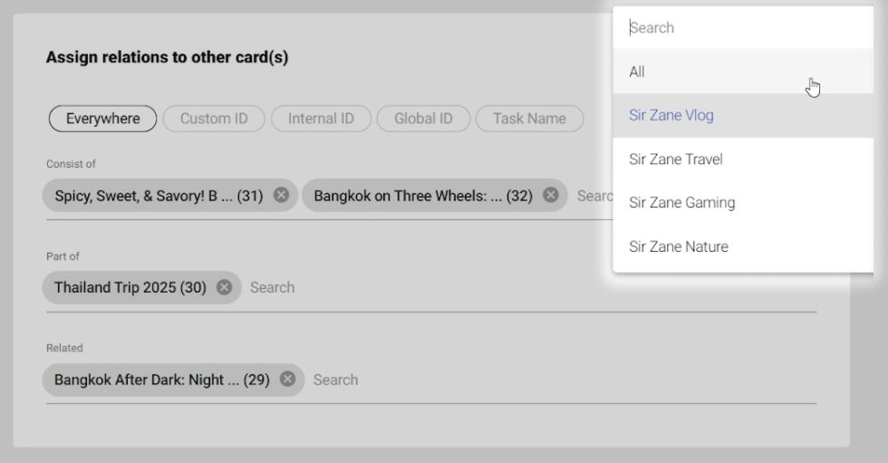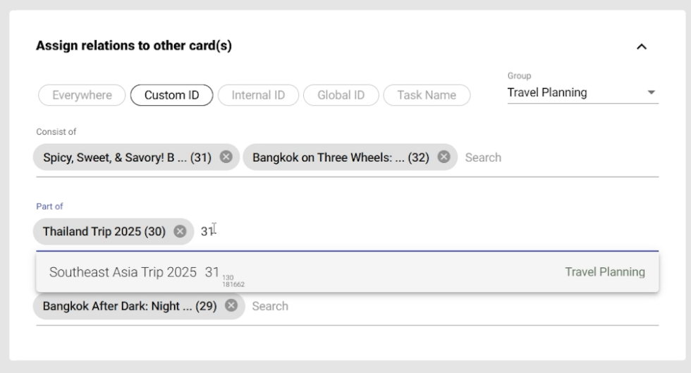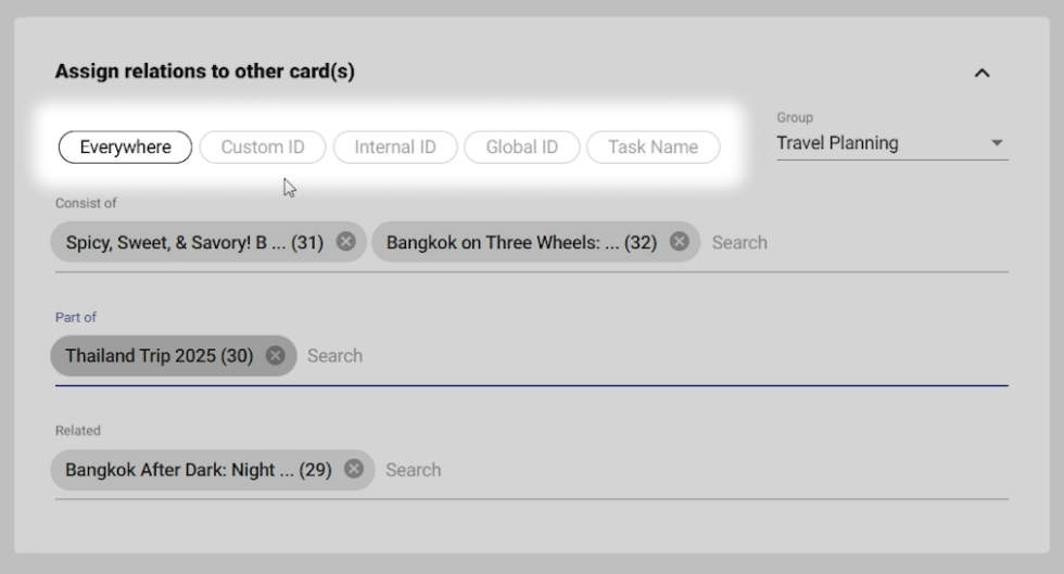 - "Part of" — for linking this card into a parent card (e.g., the video in the card is part of “Thailand Trip 2025”).