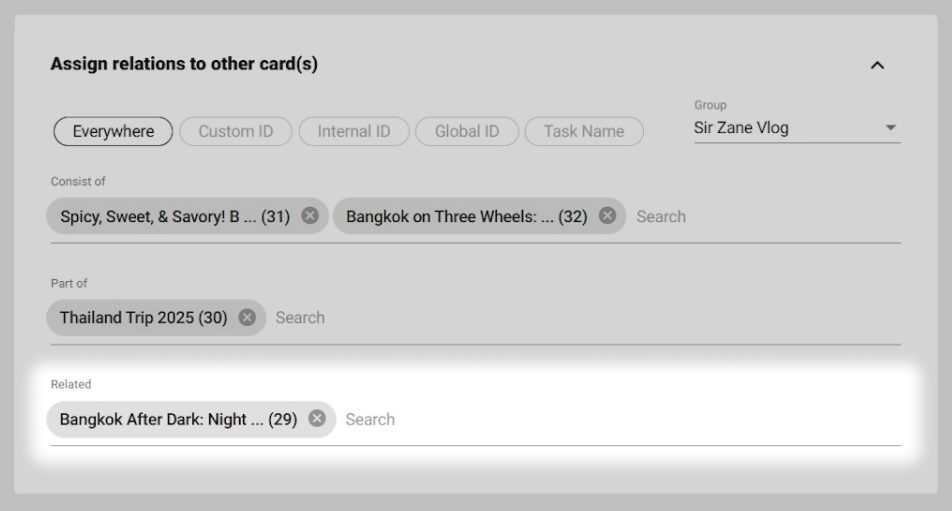 - "Related" — for connecting cards that are in the same project (e.g., other content made during the same trip).