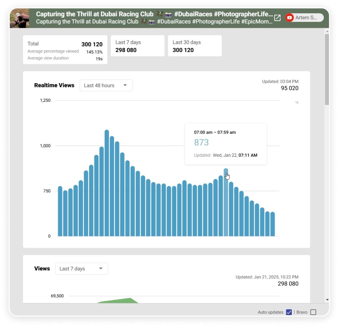 You can also monitor real-time performance, including hourly views. Real-time tracking is also available across platforms such as YouTube, Instagram, TikTok, and Facebook.