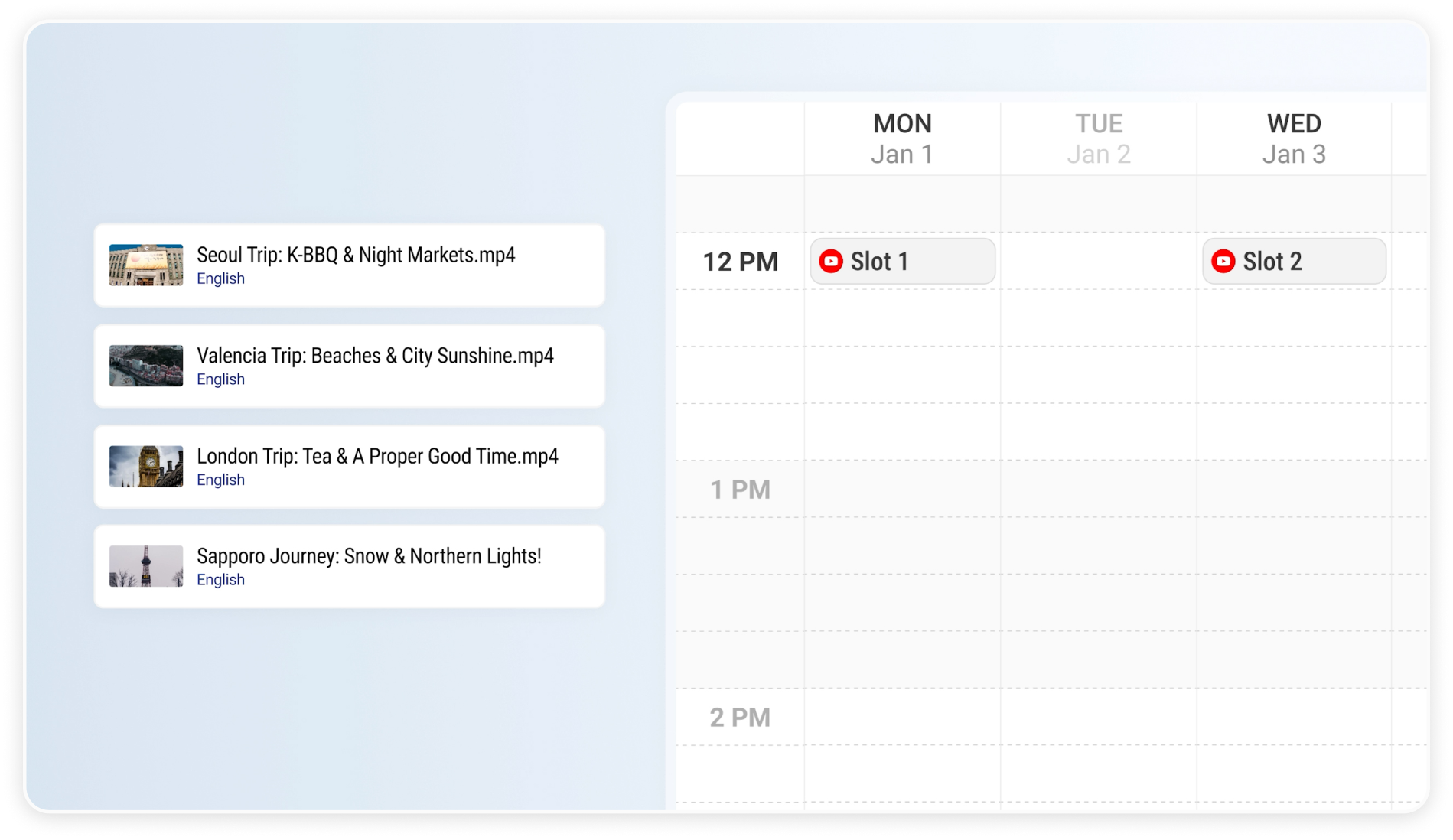 For example, if you have four posts and a schedule with Monday and Wednesday slots, the system will automatically publish them over two weeks at those exact times.