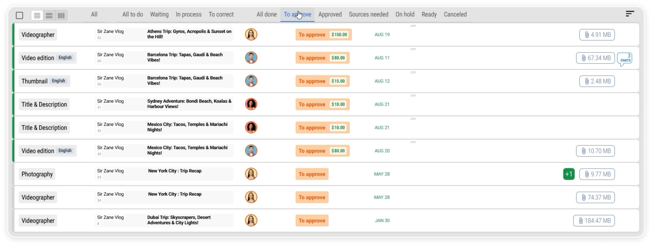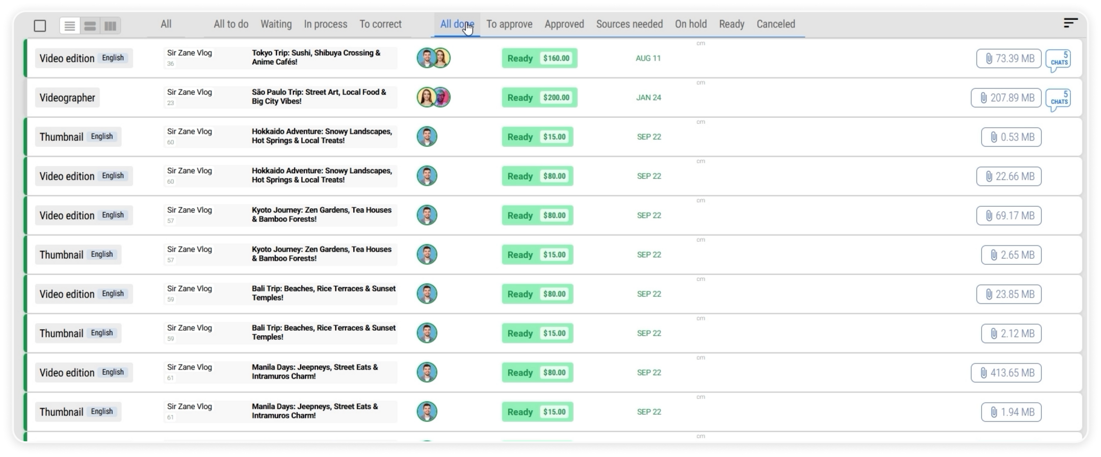 - All Done shows completed or finalized tasks such as To Approve, Approved, Ready, or Canceled