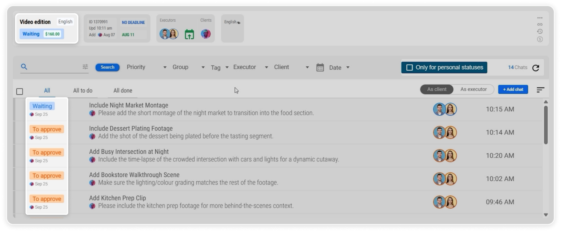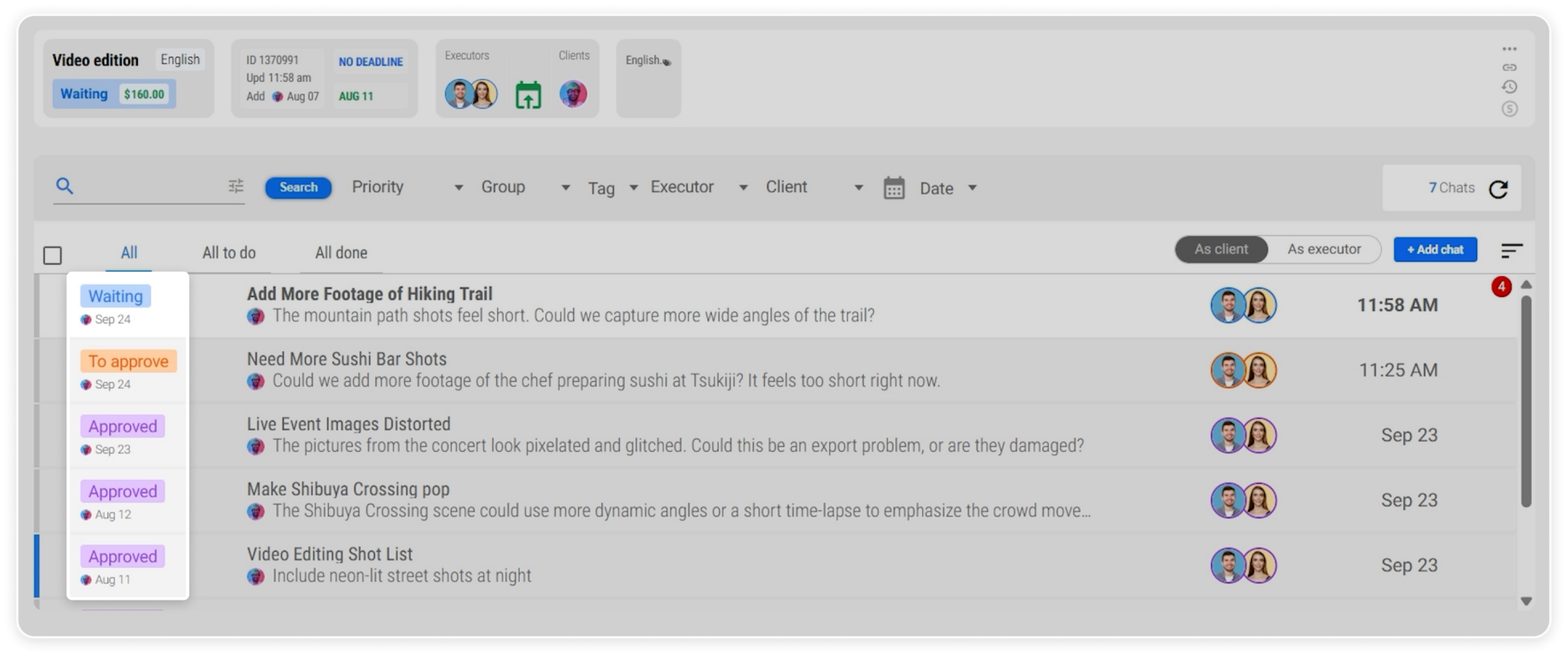 To prevent issues from being overlooked, the task automatically reflects the lowest status among its chats. This ensures that unfinished work is always visible until every topic is resolved.