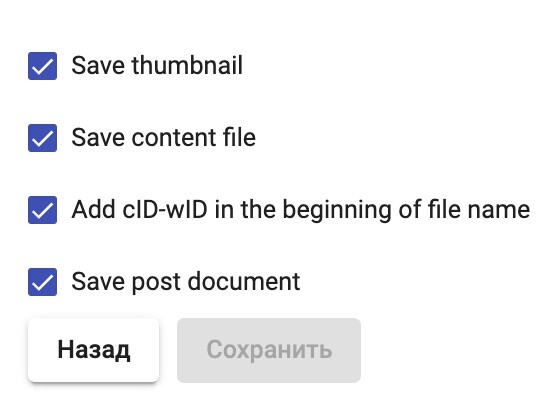 Опция с cID-wID — будет записывать ID карточки, в которую будут загружаться файлы из видео, указанного в этой карточке). Эти ID в названии файла могут быть полезны для дальнейшего поиска файла, понимания к какой карточке они относятся (если файлы вы скачаете и будете использовать в других системах. А также эти ID будут полезны для ряда автоматизаций.