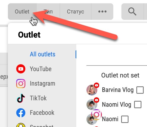 4.0 Зайдите в раздел карточек и отфильтруйте для начала карточки, в которых необходимо создать работы. Как правило в фильтре по Аутлету необходимо выбрать канал и по нему отфильтровать. Фильтр происходит через серую панель навигации вверху.